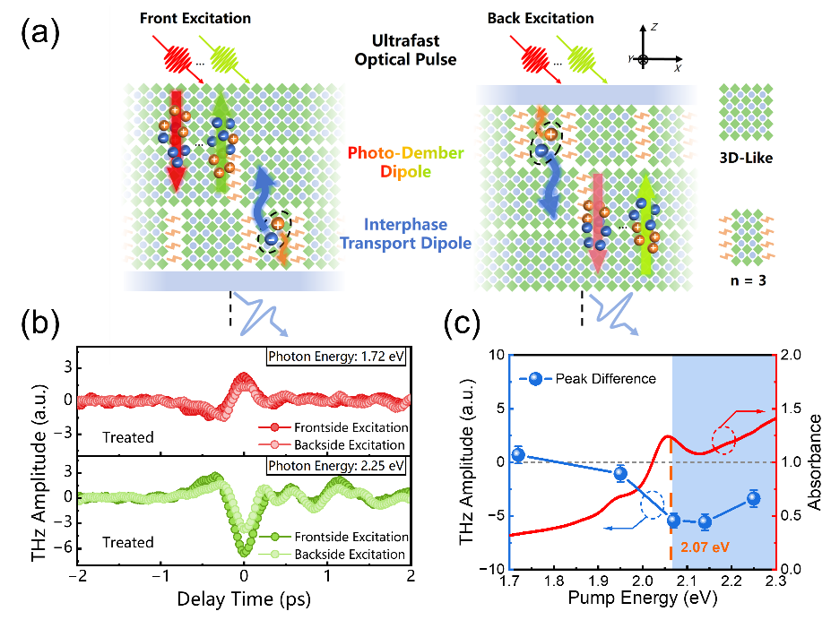 ,成功实现了对BA2MAn-1PbnIn+1 准二维钙钛矿薄膜中垂直方向瞬态电流的原位、超快探测。本研究通过选择性激发特定n相的低维钙钛矿,清晰区分并量化了垂直方向上源于载流子浓度梯度的光生丹倍电流与界面电荷转移的相间传输电流,揭示了二者的竞争关系。同时,利用太赫兹光谱研究发现,薄膜中垂直方向的[PbI6]4-无机传输通道与相对有序的晶体取向,是使其载流子迁移率较无序样品提升2倍的直接原因,揭示了结晶质量与垂直光电流传输效率的直接联系。该成果为高效、稳定的新型钙钛矿光电器件中相分布与界面传输通道的设计与调控提供了物理依据和太赫兹原位表征工具。