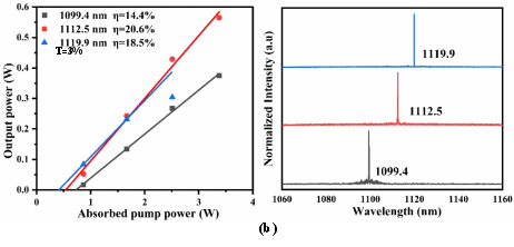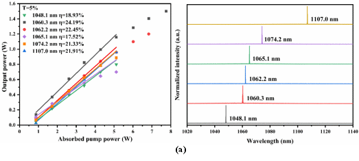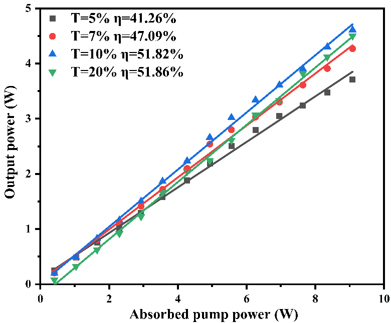 图1. Nd:GYSAG晶体不同输出透过率连续激光结果