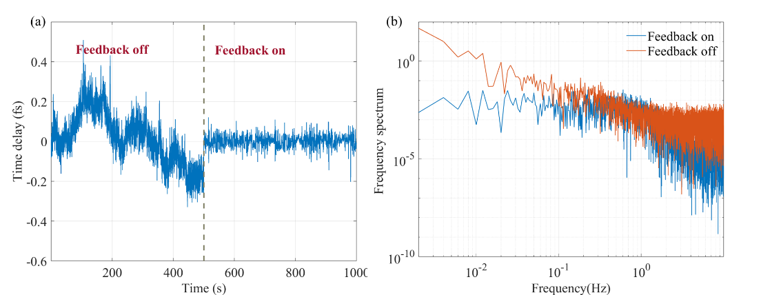 图3(a)闭环反馈控制后,束间时间抖动得到大幅抑制;(b)闭环反馈控制前后的时间抖动频率谱。