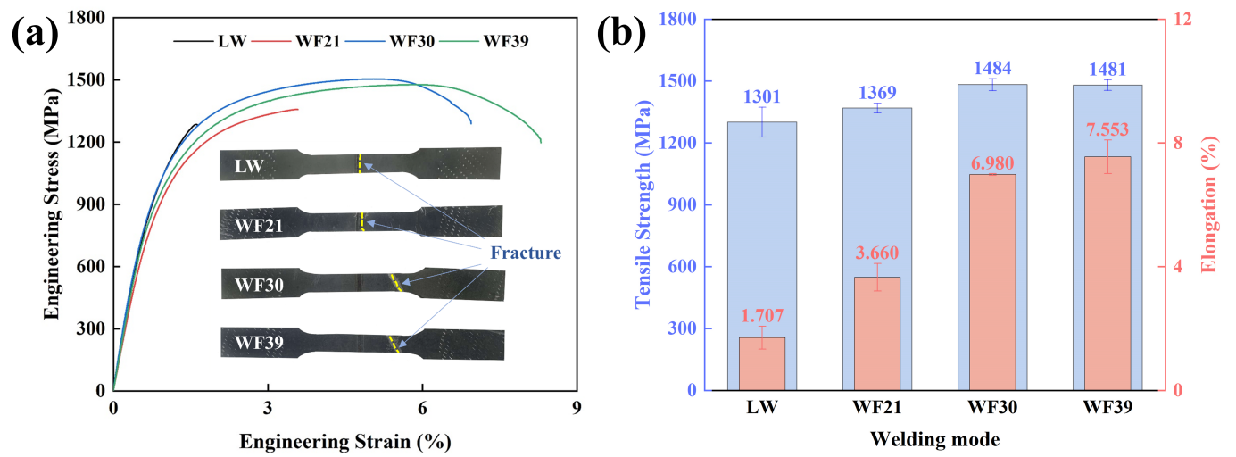 图1 焊接接头在不同稀释率下的拉伸性能:(a) 应力-应变曲线和拉伸断裂状态 (b) 焊接接头的拉伸强度和延伸率统计结果。
