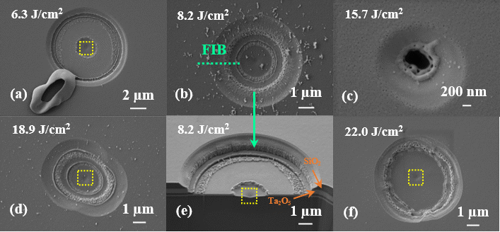 图2. (a)-(d)和(f)为不同能量密度下单波段增透膜的损伤形貌,(e)为(b)中平底坑的截面形貌
