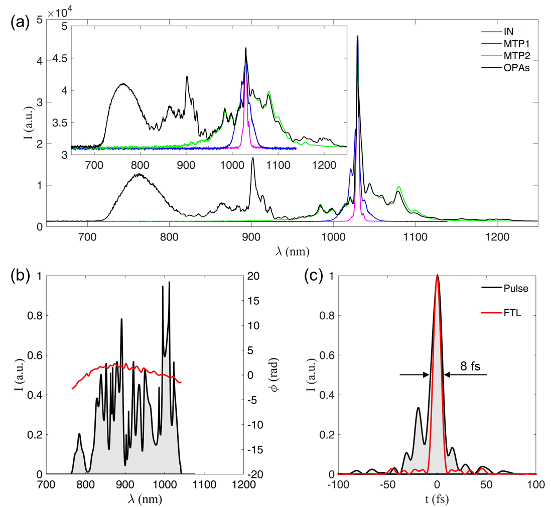本工作中,研究团队完成了500nm带宽(覆盖700nm至1200nm)超宽带种子源。驱动激光为一台4nm半高全宽的Yb:YAG工业飞秒激光器。研究团队利用薄片压缩技术与光参量放大技术将带宽拓展至500nm全宽,并实现较平坦的光谱输出。为WNOPCPA原型机建设提供了稳定可靠的种子源。