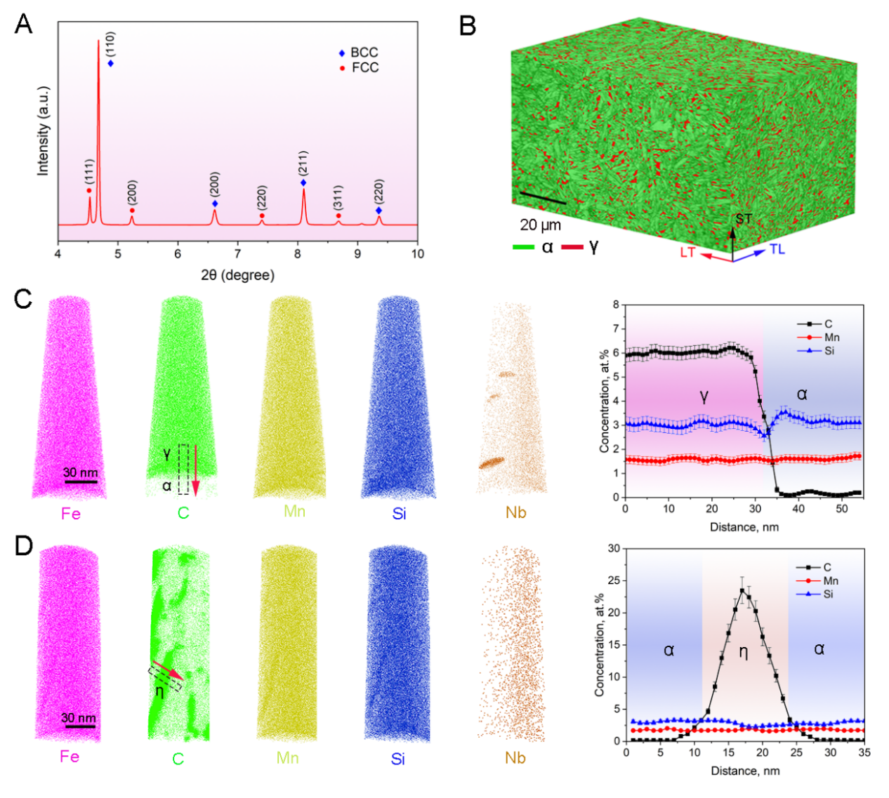 研究团队基于前期发现的位错越过马氏体/奥氏体界面(DAMAI)现象,设计并制备了一种低成本的高碳淬火-分配-回火(Q-P-T)钢,主要微观组织是贫碳的回火马氏体(α)及稳定的富碳残留奥氏体(γ)。在形变过程中,稳定的富碳残留奥氏体引发DAMAI效应,位错不断越过马氏体/奥氏体界面从α到γ中,导致α“软化”并提高其形变能力,同时运动到γ中的位错导致γ“硬化”,在保持50 GPa·%强塑积的同时,断裂韧性达到了130 MPa·m1/2,并且通过原位透射电镜发现了打破传统认知的裂纹前端吸收位错(DACF)效应。此外,在断裂过程中,裂纹前端塑性区发生DAMAI效应,裂纹前端相变区发生异常的裂纹前端吸收位错(DACF)效应,裂纹扩展过程中,马氏体中的位错不断被裂纹前端高韧性奥氏体吸收,显著缓解了马氏体中的应力集中,推迟了裂纹在马氏体中的扩展,该研究将有助于开发高强韧的马氏体钢以及其他具有应变诱发马氏体相变(SIMT)现象的高性能合金。