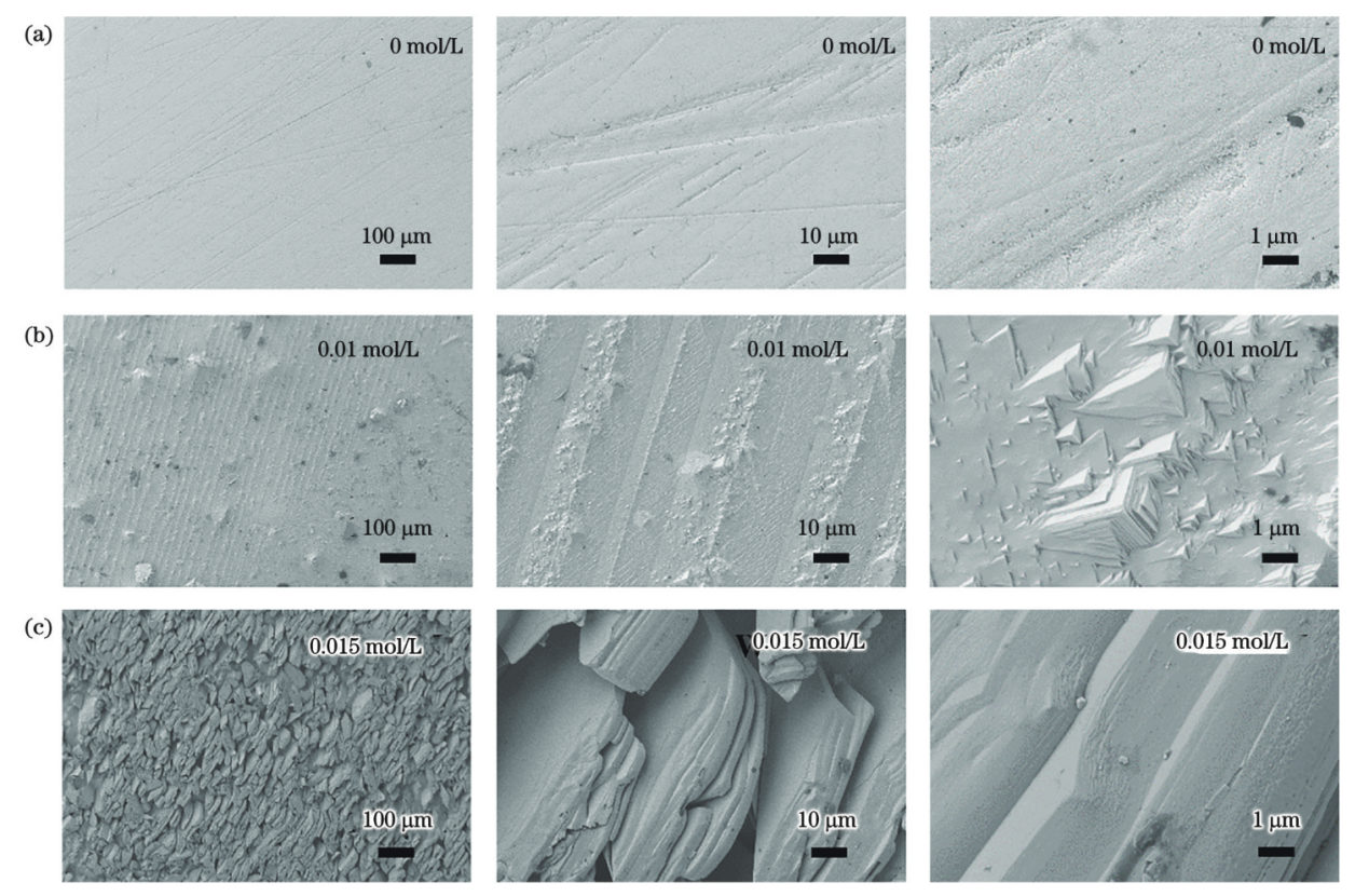 图1 不同浓度溶液钝化的 CsPbBr3单晶SEM图像。(a)无钝化,抛光后表面;(b)0.01 mol/L 钝化;(c)0.015 mol/L 钝化。