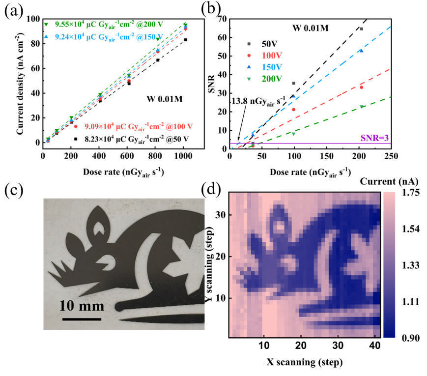 图2 CsPbBr3单晶X射线探测性能。 (a)灵敏度;(b)探测极限;(c)金属掩膜;(d)射线成像照片