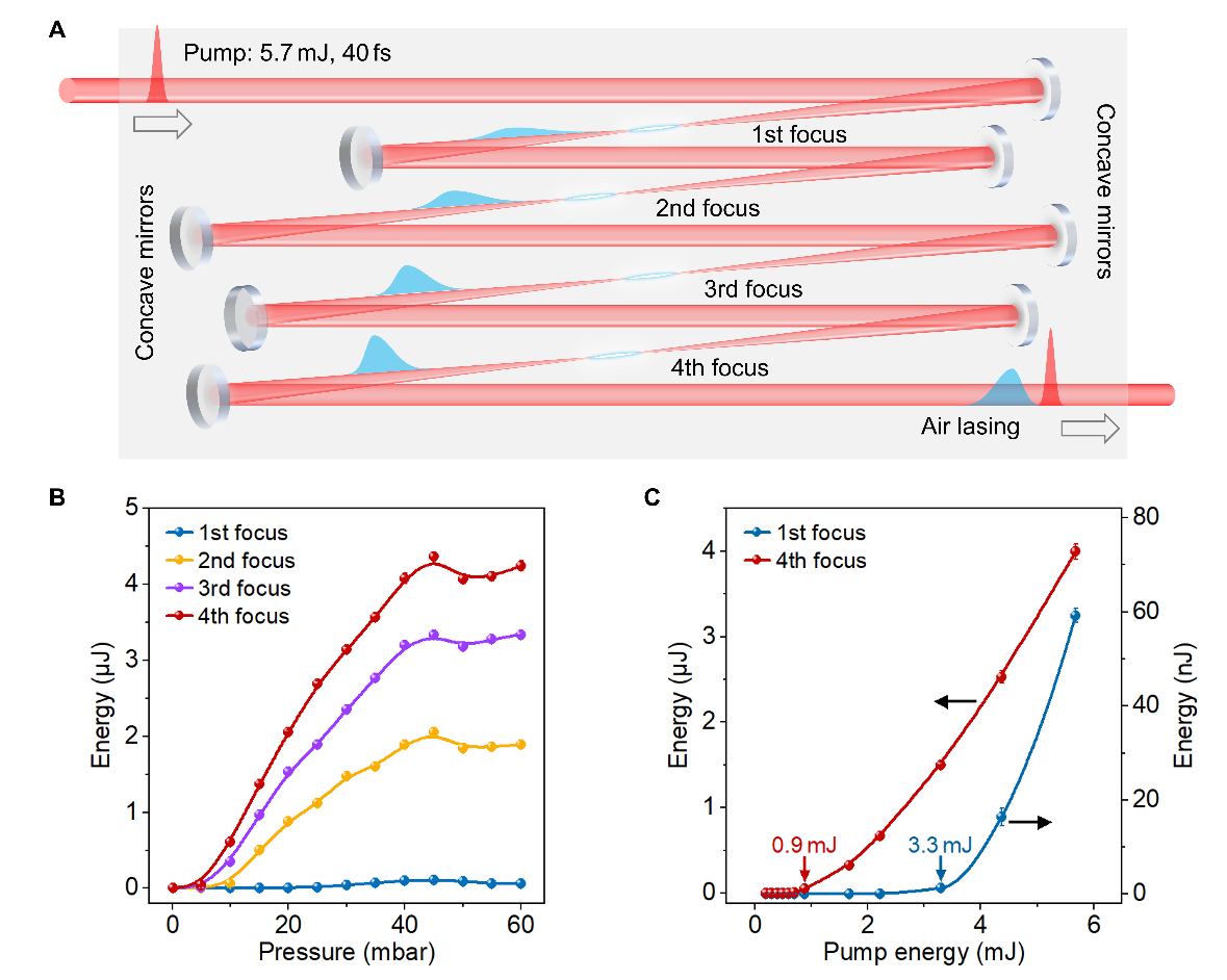 图1. (A)空气激光的级联放大方案示意图;(B)不同聚焦次数下获得的空气激光能量随气压的变化;(C)单次和四次聚焦情况下,在40 mbar氮气中获得的空气激光能量随泵浦能量的变化。