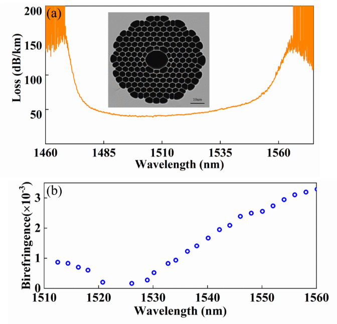 图1、(a)7芯光子带隙空芯光纤损耗谱及端面SEM图。(b)测试得到的光纤群双折射。