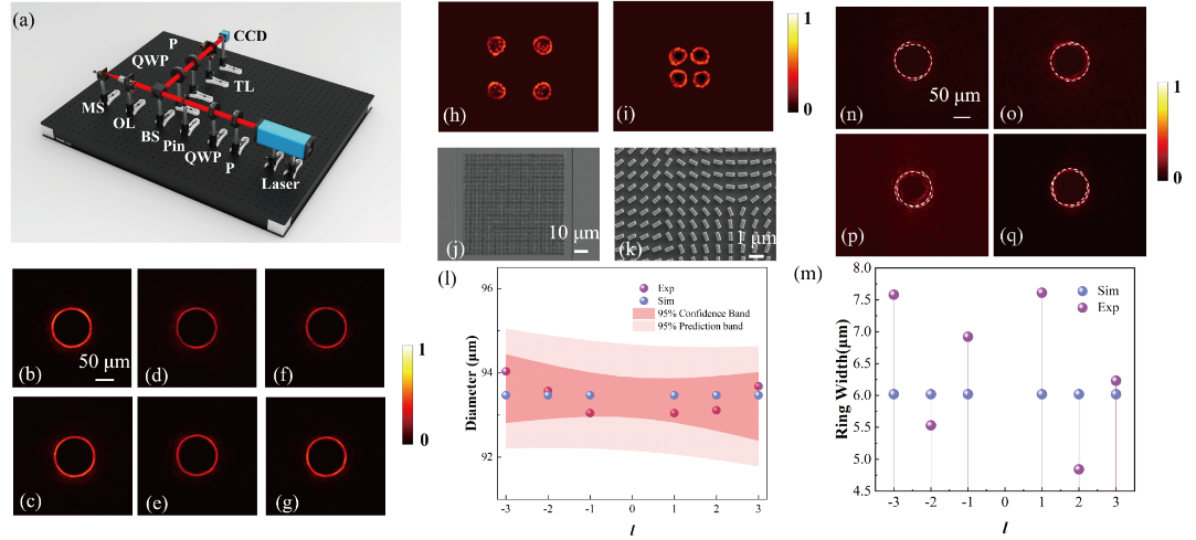 图2 反射式完美涡旋光束实验测试结果。(a)实验装置。(b) - (g)拓扑电荷分别为1、−1、2、−2、3和−3时的实验结果。(h) - (i)完美涡旋光束阵列实验结果。(j)制备超表面样品的SEM图像。(k)局部SEM放大图。(l)模拟与实验环直径结果对比。(m) 模拟与实验完美涡旋光束环宽结果对比。(n) - (q)完美涡旋光束与球面波干涉结果。