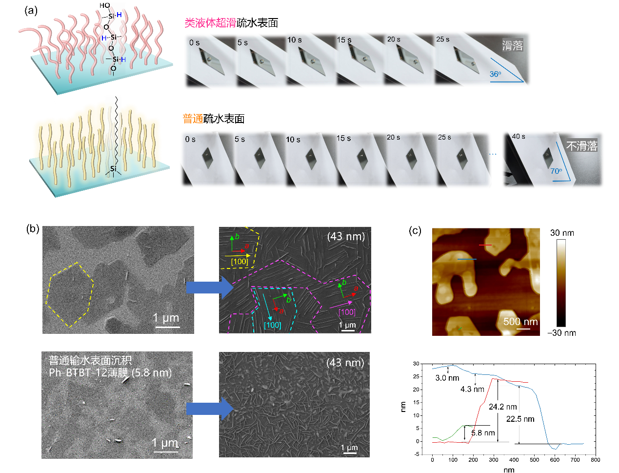 图1 (a)表面动态润湿性能,(b)上层Ph-BTBT-12半导体分子的自组装行为(上:使用类液体超滑表面;下:使用OTS普通疏水表面),以及(c)半导体分子的层层自组装截面高度图。
