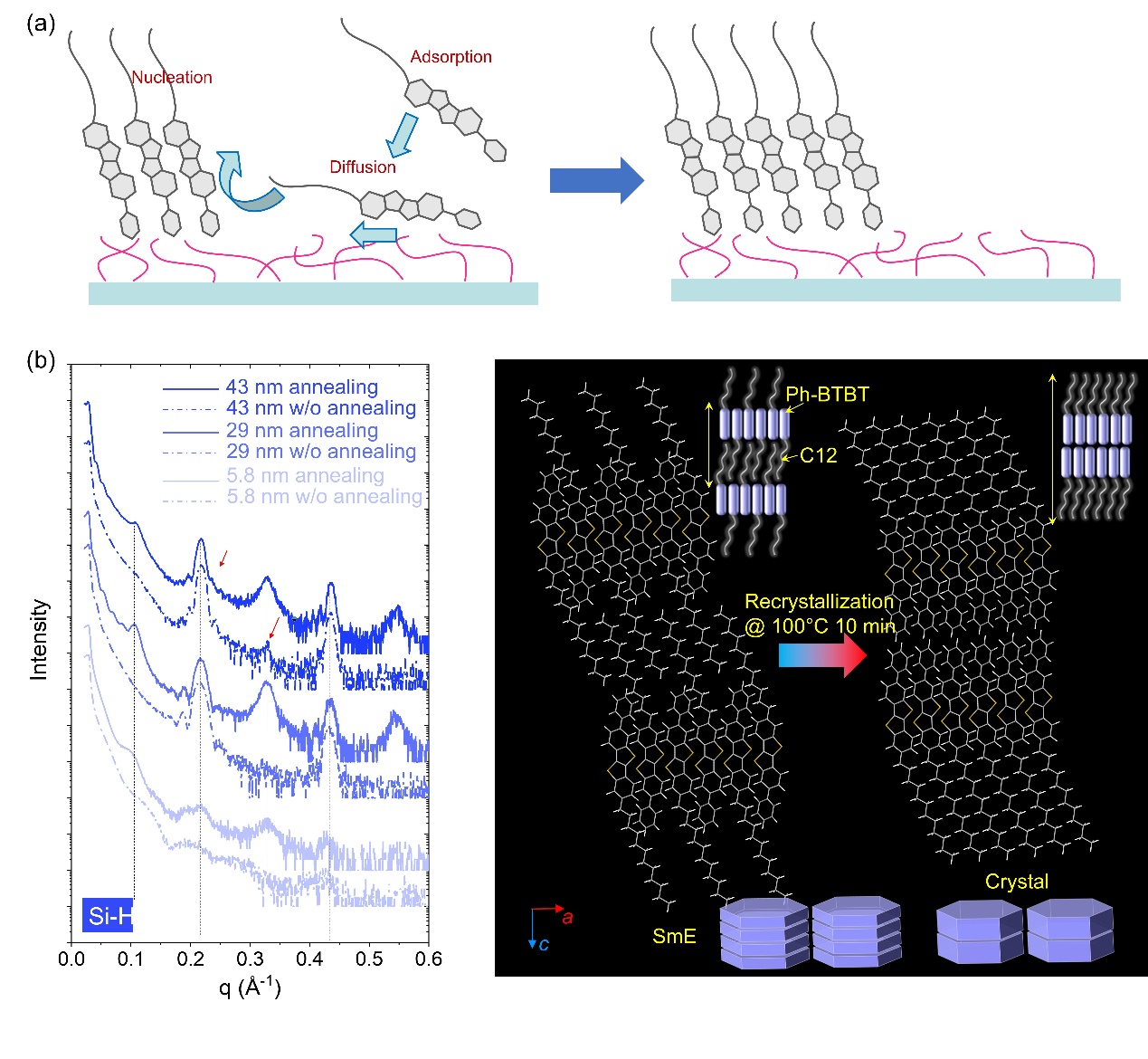图2 Ph-BTBT-12半导体分子在超滑表面的(a)组装机理;(b)热退火相变行为(左:XRR曲线;右:相变示意图)
