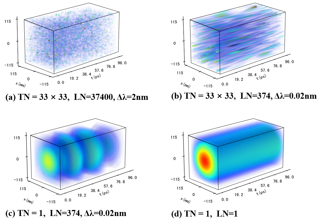 图1.三维时空光场分布图。(a)部分相干光;(b)空间不相干时间相干光;(c)空间相干时间不相干光;(d)时空相干光。TN表示横模数量,LN表示纵模数量。