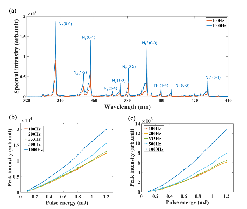 飞秒激光在空气中传播时会形成高强度的等离子体光丝,其伴随的荧光信号为探测大气成分和诊断非线性过程提供了重要手段。然而,当激光以高重复频率工作时,前一脉冲产生的局域加热与空气密度的局部降低会显著改变后续脉冲的传播环境,从而影响光丝的荧光发射。针对这一关键科学问题,研究团队通过实验测量与数值模拟相结合的方法,定量分析了不同重复频率下空气中氮分子第一负带(N₂⁺)与第二正带(N₂)的荧光变化规律。结果表明,随着重复频率升高,空气密度降低使得后续脉冲在低密度介质中以更高强度传播,导致电离增强与电子动能升高,从而显著提升了两类荧光的发射强度。
