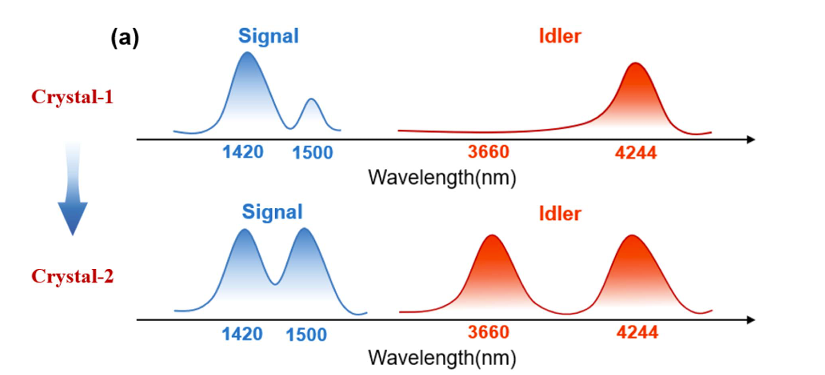 在光参量OPCPA放大过程中,由于泵浦脉冲的脉冲宽度往往在几十皮秒甚至纳秒量级,因此需要使用较长的中红外非线性晶体来有效地提高放大脉冲的能量。都生成如果简单地增加单晶的长度,那么在放大过程中,当信号脉冲和闲置脉冲的强度达到一定程度时,非线性三波耦合过程将引起来自信号和闲置脉冲的能量回流到泵浦脉冲。随着晶体长度的增加,晶体的相位匹配带宽变窄,导致输出光谱变窄,输出脉冲宽度变宽(