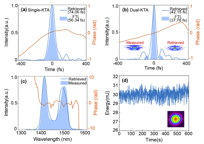 针对上述挑战,该研究团队发展了一种基于双晶体光谱级联的高效率宽带短波红外(~1.5微米)OPCPA技术。通过级联两个不同相位匹配角的晶体,实现了半高宽超过110 nm的宽带光谱放大,脉冲宽度压缩到42.15 fs。与单晶结构相比,双晶结构的光谱带宽半高宽增加了85 nm,脉冲宽度缩短了43.2%。并且,这两种晶体在不同的光谱波段具有不同的相位匹配,使得每个晶体中的三波耦合过程保持相互独立,从而可以有效地抑制能量的反向回流,提高能量转换效率,从而进一步增强放大的脉冲能量。与单晶结构相比,能量转换效率提升了17.22%,转换效率为25.9%,放大能量达到58.6mJ。在1.5微米左右波段压缩后最终获得30mJ的脉冲能量,对应于0.74TW的峰值功率。该研究展示的短波红外超强和超短激光为强场物理和非线性光学的前沿研究提供了强有力的技术支持和新颖的实验方法,它在高次谐波产生(HHG)和水窗X射线产生、阿秒超快科学、强场THz辐射及其应用以及燃烧诊断研究等各种前沿研究和应用领域都发挥着很大作用。