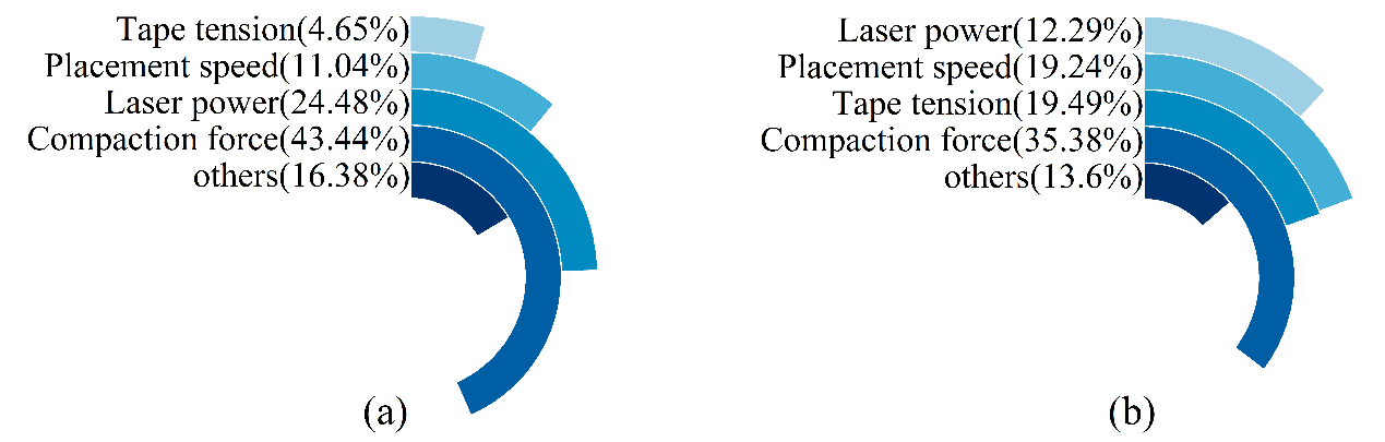 图1 铺层方向各因素影响大小饼状图:(a)正交铺层;(b) 单向铺层。