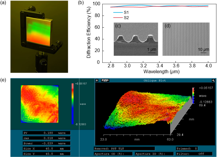 图 1 (a)首个中红外全息镀金合束光栅;(b)光栅样品在60°入射角下TM偏振衍射效率测试曲线;(c)光栅横截面SEM图像和(d)表面俯视SEM图像;(e)光栅样品的-1级衍射波前