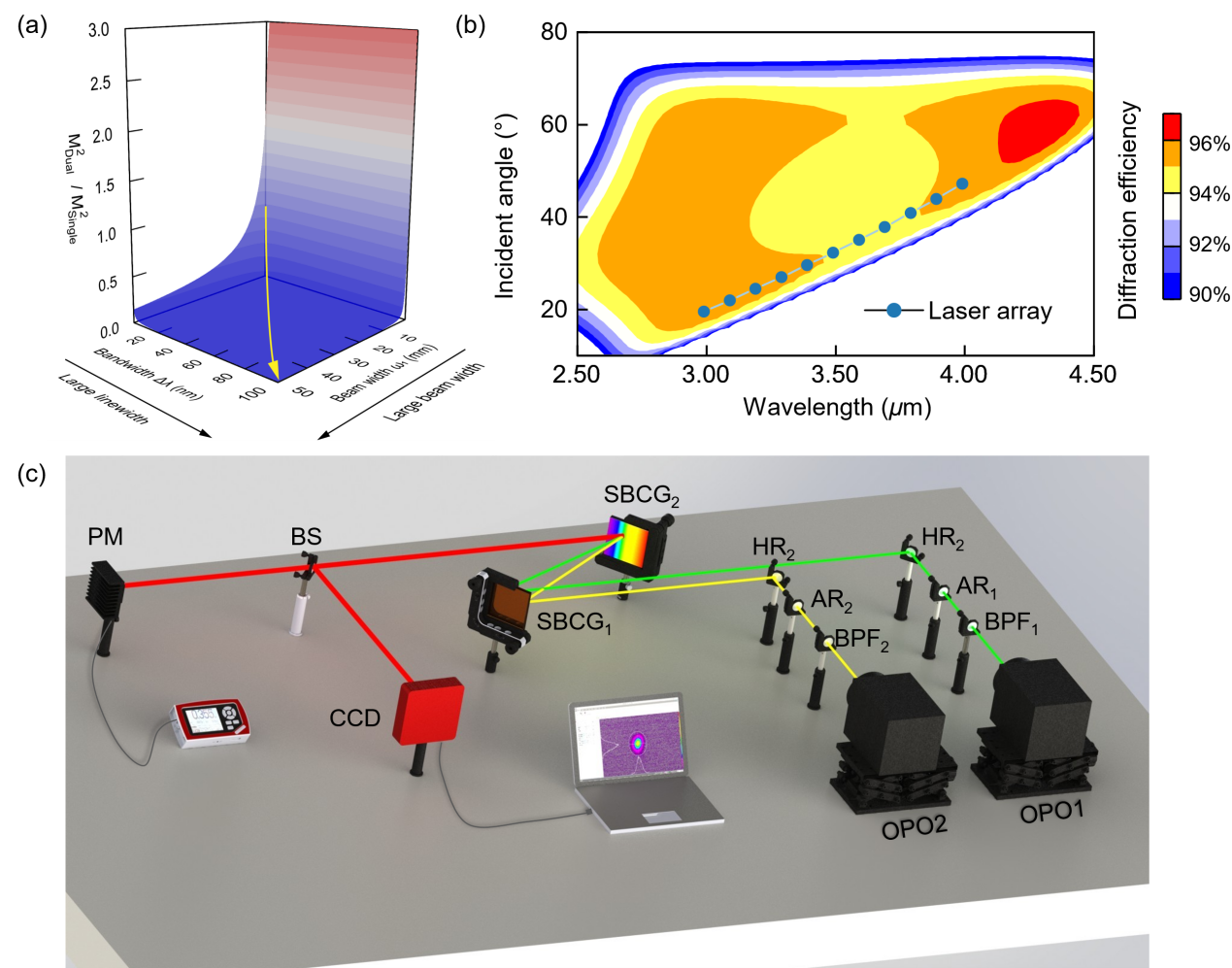 本研究系统分析了中红外宽光谱激光在合成系统中的空间色散与逆色散耦合机制(图2(a)),从系统层面分析了光栅光谱、角谱与入射光阵列的内在关联(图2(b)),并构建了双光栅合束实验系统(图2(c)),使用中心波长为3.16 μm与3.89 μm的光参量振荡(OPO)激光进行实验验证。结果显示,合成效率达92.5%,合成光束BPP=1.99 mm·mrad,光束质量保持良好。该合束光栅在连续激光辐照下可承载超过1000W/cm2的功率密度,相较现有商用刻划光栅提升4倍,展现出该光栅在高功率中红外激光系统中的实际应用潜力,并为未来实现数十至数百瓦级中红外合成激光系统提供了关键器件支持。