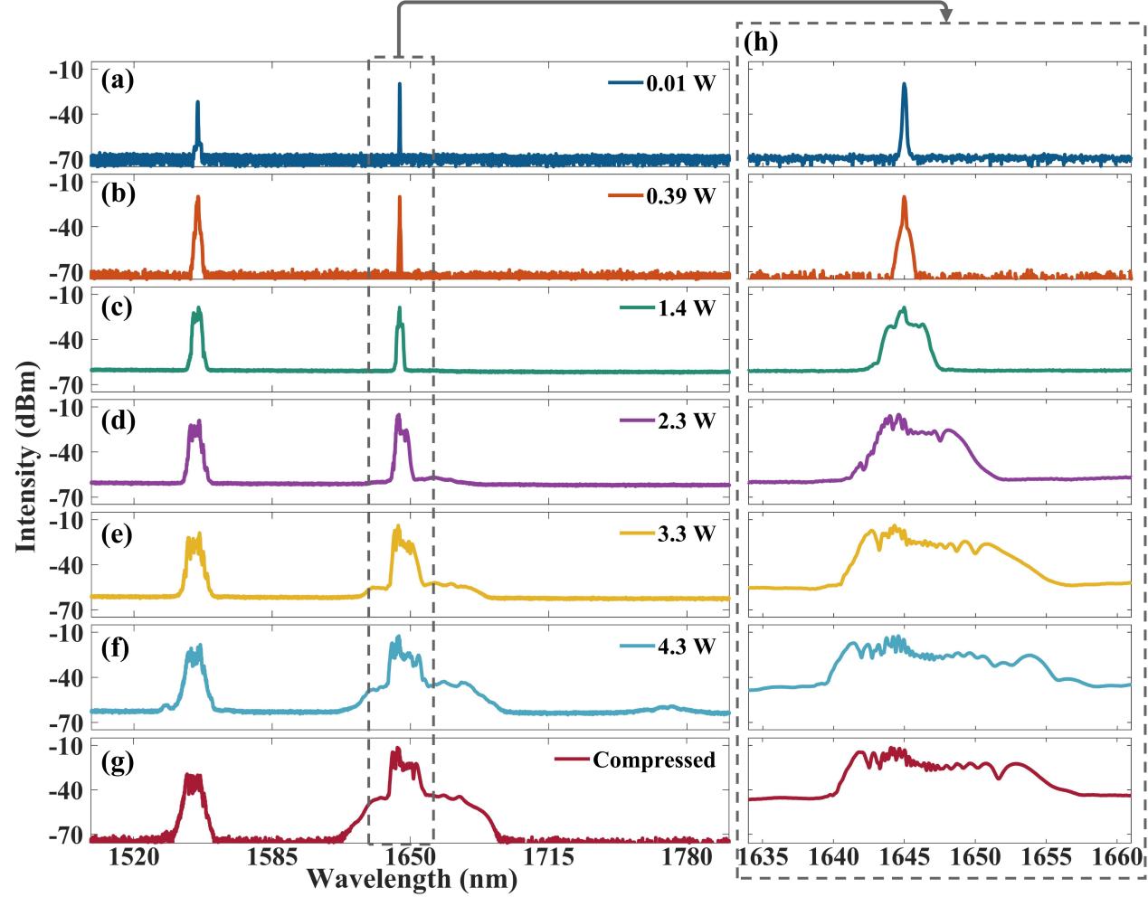 图2:随1550 nm泵浦功率提高,1645 nm单频激光在拉曼增益调制作用下发生显著光谱展宽。a-f: 泵浦功率逐渐提高,单频激光被调制实现光谱展宽;g: 经过脉冲压缩后的光谱;h: U波段光谱细节
