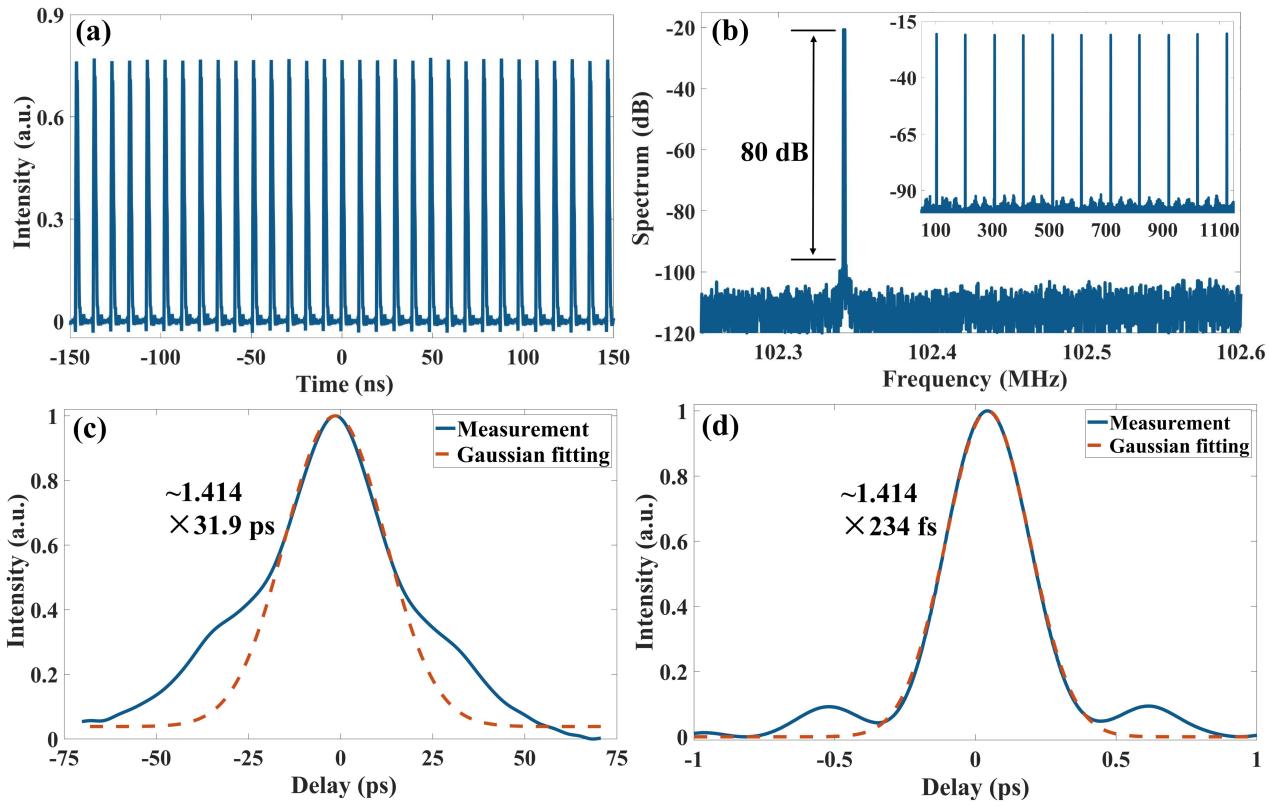 图3:最大泵浦条件下输出的U波段激光脉冲性能表征:时域脉冲串(a);射频谱(b);压缩前(c)与压缩后的脉冲自相关信号(d)