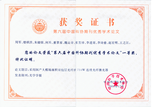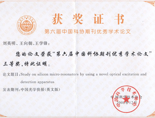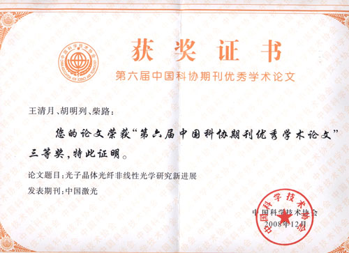 第六届中国科协期刊优秀学术论文评选结果于2009年1月7日揭晓,由我所主办的《光学学报》、《中国激光》、《Chinese Optics Letters》三刊选送的3篇论文分别获得优秀学术论文一等奖1篇,三等奖2篇。