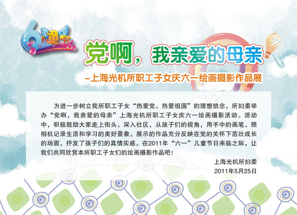 活动三:绘画摄影活动。为迎接中国共产党建党90周年,进一步树立我所职工子女“热爱党、热爱祖国”的理想信念,所妇委举办“党啊,我亲爱的母亲”——上海光机所职工子女庆“六一”绘画摄影活动。活动积极鼓励大家走上街头、深入社区,从孩子们的视角,用手中的画笔、照相机记录生活中的美好景象,反映在党的关怀下茁壮成长的场面,抒发孩子们的真情实感。
