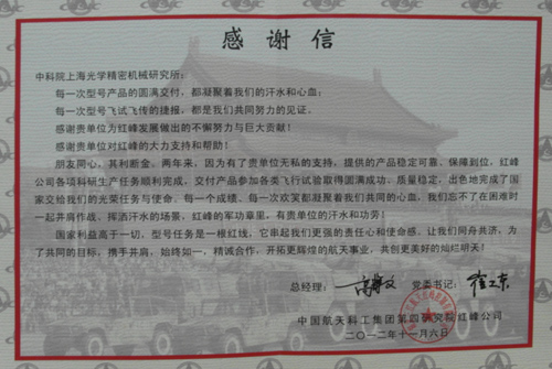 上海光机所获得航天科工集团红峰公司表彰和感谢