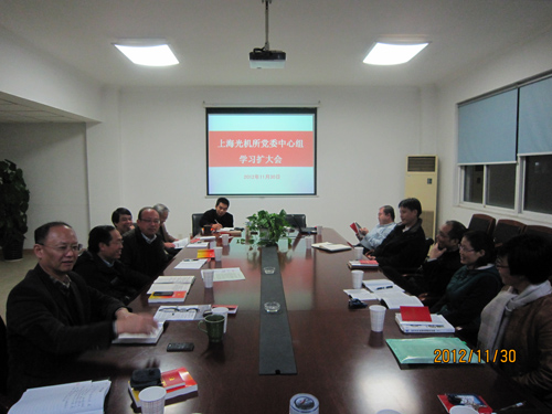 11月30日晚上,上海光机所党委中心组举行学习扩大会,认真学习贯彻党的十八大精神,党委书记、副所长邵建达,副所长祝如荣,党委委员和全体机关支撑部门负责人参加了学习会。