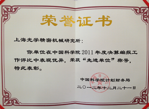 继2008、2009、2010年获中科院报表决算先进单位表彰后,上海光机所日前再次获得2011年度中科院报表决算工作先进单位表彰。