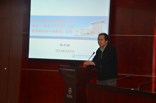2月3日下午,在2012年度机关工作交流述职会议上,副所长、纪委书记陈卫标向参加会议的全体机关工作人员、研究室负责人、所控股公司负责人等传达了中科院党组《贯彻落实<八项规定>、改进工作作风、密切联系群众的12项要求》(科发党字〔2013〕3号)文件,12项要求是:1.注意统筹安排,提高调研效率;2.注重实际效果,防止形式主义;3.简化安排接待,提倡勤俭务实;4.减少数量,规范审批程序;5.控制经费支出,反对铺张浪费;6.精简文件,提高质量和针对性;7.严格控制简报,减少纸张使用;8.统筹安排院、局领导的出访活动;9.控制费用支出;10.精简院领导活动报道;11.简化院级会议报道;12.严格控制公务接待和公务用车配备。陈卫标对每项要求的具体内容进行了说明。