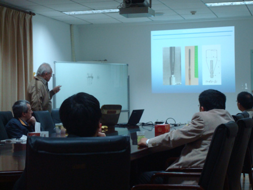 Balbashov教授是垂直结构光学浮区炉的发明人,其生产的浮区炉工作温度高达3000℃,可以在100大气压下工作,并且附有高温退火装置,因此,该浮区炉可以实现其他条件下无法实现的晶体生长。本次Balbashov教授作了题为“Floating zone crystal growth under high pressure”的学术报告,报告介绍了该浮区炉的原理、基本组件,以及氧化钛、氧化镓、YIG等晶体的生长工艺。中科院强激光材料重点实验室相关科研人员认真聆听了这场精彩的学术报告,并在会后对浮区炉生长晶体的过程中实际遇到的问题进行了有针对性问询,Balbashov教授对此进行了细致回答。(中科院强激光材料重点实验室供稿)