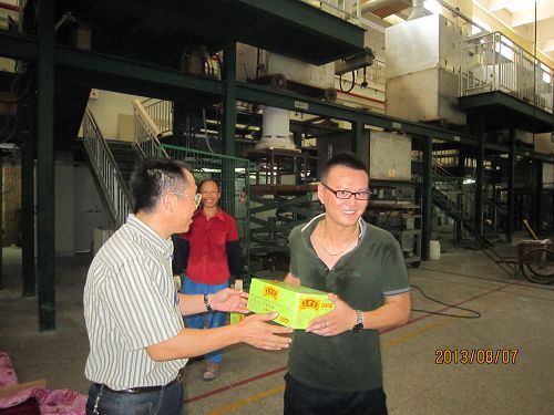 邵建达首先来到单元技术中心的钕玻璃连熔线,亲切慰问了在连熔线工作的职工。连日高温天气使工作环境更加艰苦,走进车间就热浪滚滚,但是,为了钕玻璃的生产任务,钕玻璃连熔线的职工仍然坚持奋战在高温一线。邵建达将饮料递给大家,希望大家注意身体健康,做好防暑降温工作。随后,邵建达又来到激光光源中心的玻璃吹制车间和恒益公司的机械加工大车间,慰问了高温一线工作的职工。
