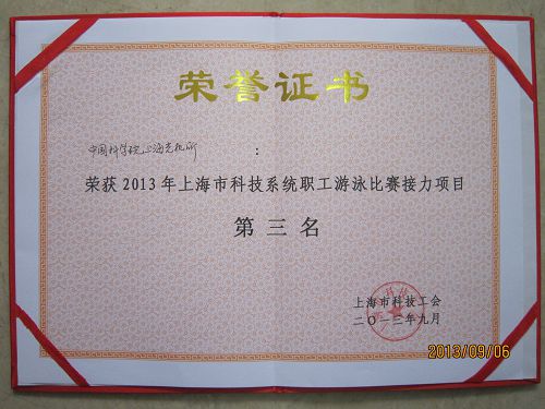 9月5日上午,2013年上海市科技系统职工游泳比赛在上海大学生体育中心游泳馆举行,上海光机所游泳队在多个比赛项目中取得好成绩,分获中老年组(40周岁以上):女子40米自由泳第四名、男子80米自由泳第四名、男子80米蛙泳第四名,4×40米混合接力第三名,上海光机所游泳队最后荣获了团体总分第三名。