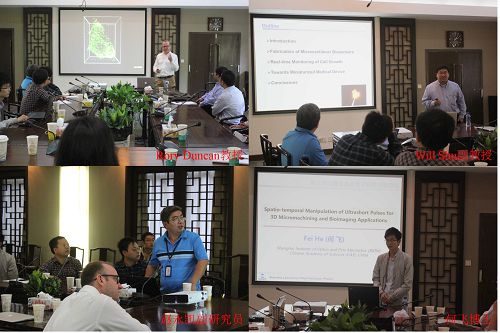 在学术交流会上,Rory Duncan教授和Will Shu副教授分别作了题为“Imaging the molecular biology of secretion”和“Development of microcantilever biosensor arrays for biodetection” 的主题报告。我所赵永凯副研究员和何飞博士分别作了题为“Some studies on optical real-time bio-aerosol detection techniques”和“Spatio-temporal manipulation of ultrashort pulses for 3D micromachining and bioimaging applications”的报告。随后,与会者就相关内容进行了热烈的交流和探讨。
