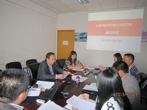 10月29日下午,上海光机所纪委在1号楼学术沙龙举行新聘任中层干部集中廉政谈话,纪委书记、副所长陈卫标与新聘任中层干部贺洪波、胡宏伟、王琴、周增会、宋丹、胡卫芳六位同志进行了廉政谈话。