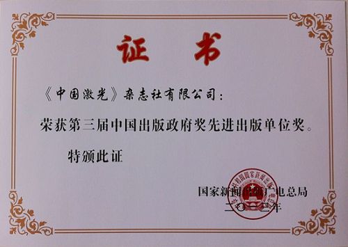 1月4日下午,国家新闻出版广电总局在京召开第三届中国出版政府奖表彰大会, 中国激光杂志社荣获“先进出版单位奖”。中国出版政府奖是我国新闻出版行业的最高奖,由国家新闻出版与广电总局设立,每三年评选一次,旨在表彰和奖励国内新闻出版业优秀出版物、出版单位和个人。第三届“中国出版政府奖”共评选出图书奖、期刊奖、音像电子网络出版物奖、印刷复制奖、装帧设计奖、先进出版单位奖、优秀出版人物(优秀编辑)奖等七个子奖项。