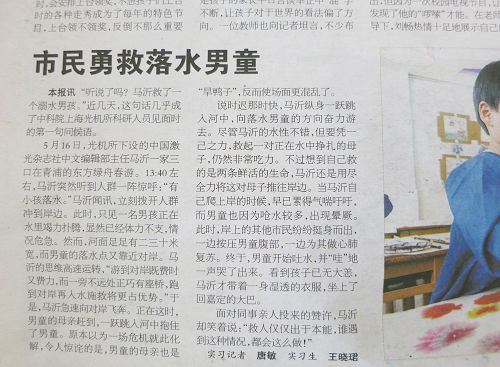 河水似乎挺深,眼见着身高一米七的男童妈妈似乎都踩不到底,并且呛了几口水。已经冲到河对岸的马沂顾不得脱下身上的衣服,就一头扎进了水中,游到了这位母亲身边。此时男童母亲保持了冷静,一手抓住马沂,另一手托住孩子;就这样,三人慢慢游往岸边。即将靠岸之时,又有另外一名热心的市民从河的另一岸跳入了水中并游过来,从身后推着母子到达岸边。这时,岸上更多地热心市民伸出双手,将几人拉上岸。见到人群中有人对小孩施救,而小孩也无大碍,马沂才拖着一身湿透的衣服,坐上了回嘉定的大巴。