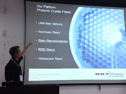 Weidong Sheng首先向大家简单介绍了NKT公司的基本情况。随后,Thomas先生向大家介绍了光子晶体光纤相对于普通双包层光纤所具有的独特性能,及其在光纤激光器设计上的应用,并分析了光子晶体光纤应用于单频激光器、超连续激光器、高功率脉冲激光器的几个典型案例。随后,与会人员与Thomas就光子晶体光纤高功率下模式抖动、光纤散热、损伤阈值等问题进行了讨论和交流。