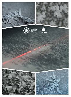 这是一张飞秒强激光成丝在云室内照射约60分钟后观察到的图片,左上角和右下角为冷板上自然形成的雪花,右上角和左下角的激光光丝诱导产生的雪花。