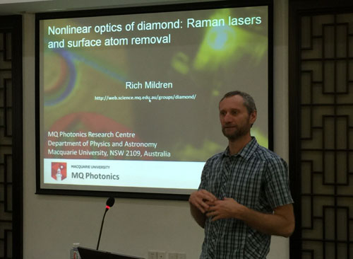 Rich Mildren教授在报告中着重介绍了金刚石独特的光学、热学及机械特性,特别是其作为拉曼激光器增益介质的优势,详述了研究团队在高功率、高亮度CVD金刚石拉曼激光器方面的系列工作。此外,他还介绍了研究团队在紫外激光实验中发现的双光子表面原子去除现象(two-photon surface atom removal)。报告会,Rich Mildren教授和与会人员进行了热烈讨论,并就未来合作研究与学术交流计划进行了交流。