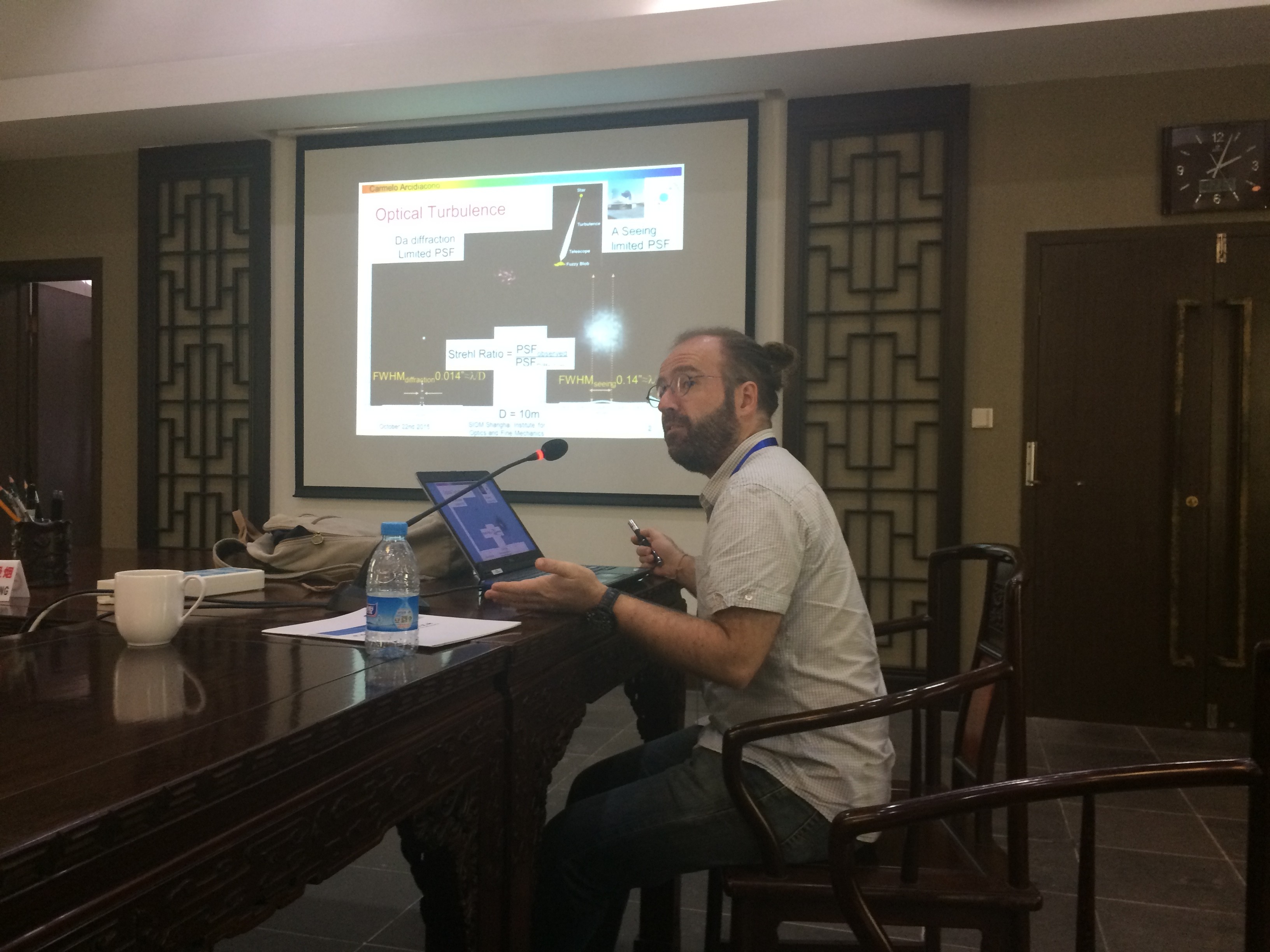 Carmelo Arcidiacono博士以双目大望远镜(LBT)的多层共轭自适应光学系统(MCAO)的研制为例,深入浅出地阐述了自适应光学技术在天文观测技术中的发展和应用,并进一步对传统单层共轭自适应光学和地面层自适应光学系统进行了对比分析,指出了各自的特点和局限性。同时,Carmelo Arcidiacono博士以双目大望远镜(LBT)的多层共轭自适应光学系统(MCAO)为依托,详细介绍了MCAO自适应光学系统的原理及其设计。报告结束后,Carmelo Arcidiacono博士与参会人员就自适应光学相关技术问题进行了深入交流,并就双方进一步的合作进行了讨论。