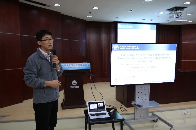 11月13日,复旦大学物理系田传山研究员应邀作客第43期“尚光学术沙龙”,作了题为“通过具有更好表面分辨率和频光谱揭开界面(表面)微观结构”的学术报告。在报告中,田传山研究员系统阐述了和频光谱(SFS)在表面检测研究中的应用,并介绍了他所领导的课题组在通过测量电四极体(electric-quadrupole bulk)光谱推导非极性介质表面光谱等方面所取得的研究进展和技术突破。在报告结束后,田传山研究员和与会人员围绕相关技术和应用问题展开了深入的交流与探讨。