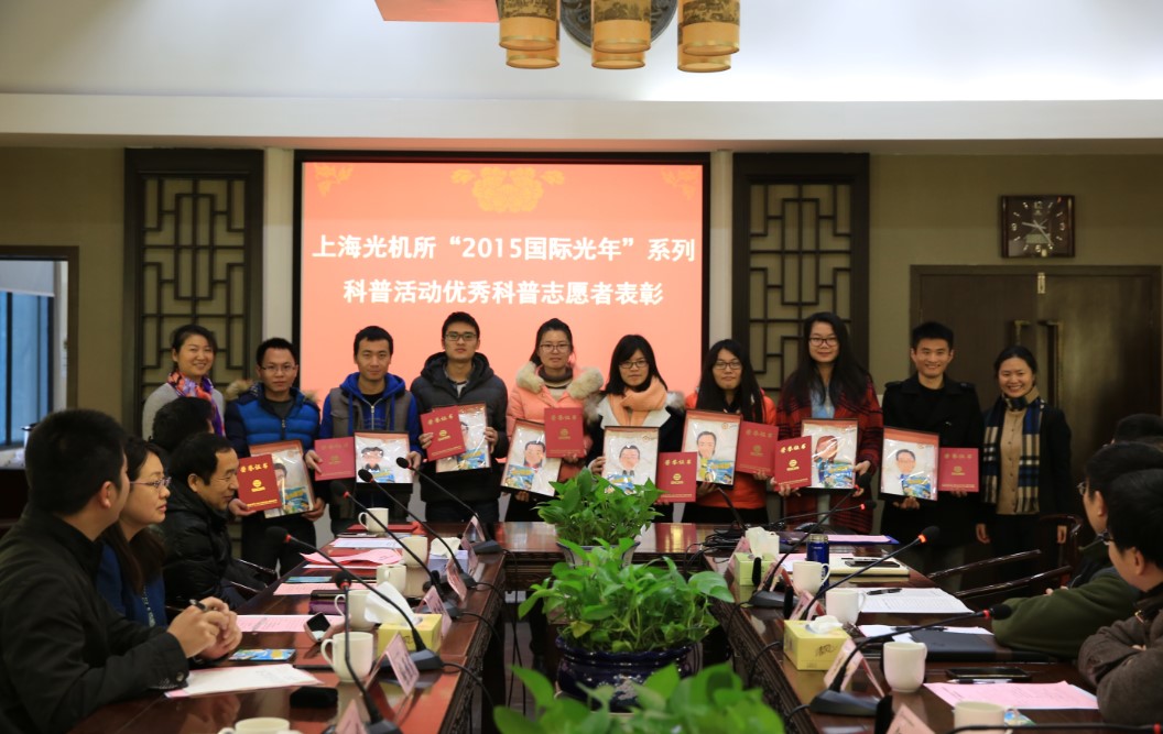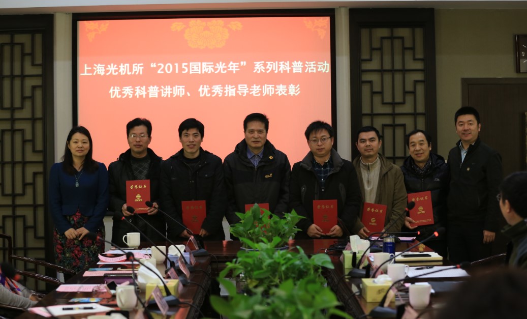 2015年,上海光机所积极响应学界号召,紧紧抓住“2015国际光年”这一光学科普契机,组织策划了集大型主题活动、新媒体视频传播、光学摄影比赛、科技教育课堂和科普图书出版于一体的系列科普活动,通过多形式、多层面、多维度的科学传播,将光学科学知识、科学方法、科学精神传递给全社会。相关科普作品与活动得到了社会的广泛认同,其中:“追光逐梦”系列科普微视频荣获由科技部组织评选的“2015年全国优秀科普微视频”(全国共50部,该系列2部入选);推荐的《追光》一书荣获科技部组织评选的“2015年全国优秀科普作品”(全国共50部);“光魅”获奖作品在中国科技馆展出,并被《科学画报》等多家媒体刊发;科普讲师、志愿者群体全年进行的科普志愿服务累计超过150人次,相关活动获得新华社、上海电视台、《文汇报》等多家媒体关注和报道。
