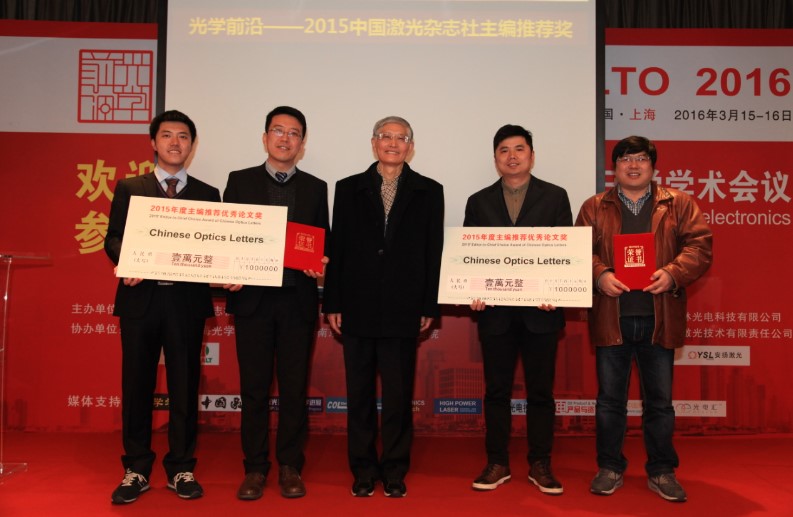 会上还进行了2015年“主编推荐奖(EIC's Choice Award)”的颁奖。在Chinese Optics Letters,High Power Laser Science and Engineering以及Photonics Research等3刊中遴选出4篇论文,上海光机所的刘亮研究员、清华大学的王力军教授、捷克&法国的S.Weber & C.Riconda、英国伦敦帝国理工学院的R.I.Woodward获奖。