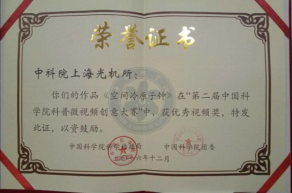 12月4日,2016年中科院网络科普联盟会议在北京召开。会上举行了“中国科学院第二届科普微视频创意大赛”颁奖仪式,上海光机所科普作品《空间冷原子钟》荣获“优秀视频奖”。“中国科学院第二届科普微视频创意大赛”于2016年5-9月开展,活动由中国科学院科学传播局、中国科学院团委主办,来自全院30多个院所的57部科普创意脚本和科普微视频参赛。经过多轮评比,共评选出“优秀视频奖”5名。