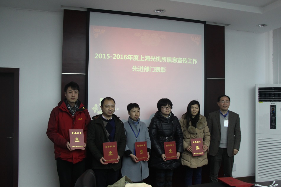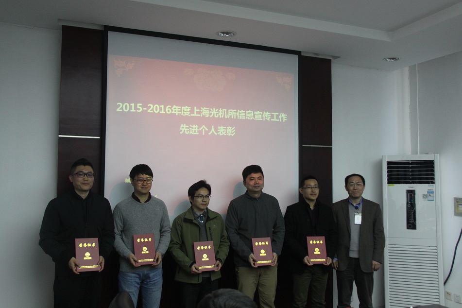会议首先表彰了2015-2016年度上海光机所信息宣传工作先进部门和先进个人,高功率激光物理联合实验室、强场激光物理国家重点实验室、中科院强激光材料重点实验室、综合管理处、人事教育处荣获2015-2016年度“上海光机所信息宣传工作先进部门”称号;周增会、屈求智、刘垠垚、王文鹏、周田华、吴文兵六人荣获2015-2016年度“上海光机所信息宣传工作先进个人”称号,邵建达为获奖部门及个人颁奖。随后,先进部门代表强场激光物理国家重点实验室信息员杨彦丽介绍了研究室科学传播工作经验;先进个人代表屈求智就其参与的“空间冷原子钟”宣传报道工作进行了交流。