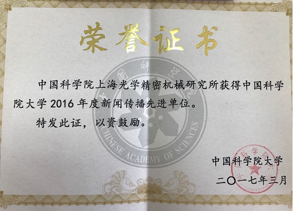 经中国科学院大学评选,上海光机所荣获“2016年度中国科学院大学新闻传播先进单位”。