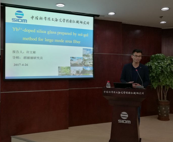 高功率激光单元技术研发中心2014级博士研究生许文彬作了题为“Sol-gel法制备掺Yb3+石英玻璃及大模场光纤的研究”的报告。报告介绍了高功率掺Yb3+光纤激光器的应用背景及发展现状,以及常用的掺Yb3+光纤预制棒制备技术在大模场光纤制备上的优势及不足。重点讲述高功率激光单元技术研发中心石英课题组自主开发的一套新的稀土掺杂芯棒制备技术—Sol-gel法结合粉末烧结。最后许文彬结合自身的科研经历分享了研究生期间的感悟及工艺技术研究上的体会。许文彬同学曾获得“闽能优秀学生奖学金一等奖”(2016年),中国科学院大学“三好学生”称号(2013年,2016年),硕士研究生国家奖学金(2014年)。(人事教育处供稿)
