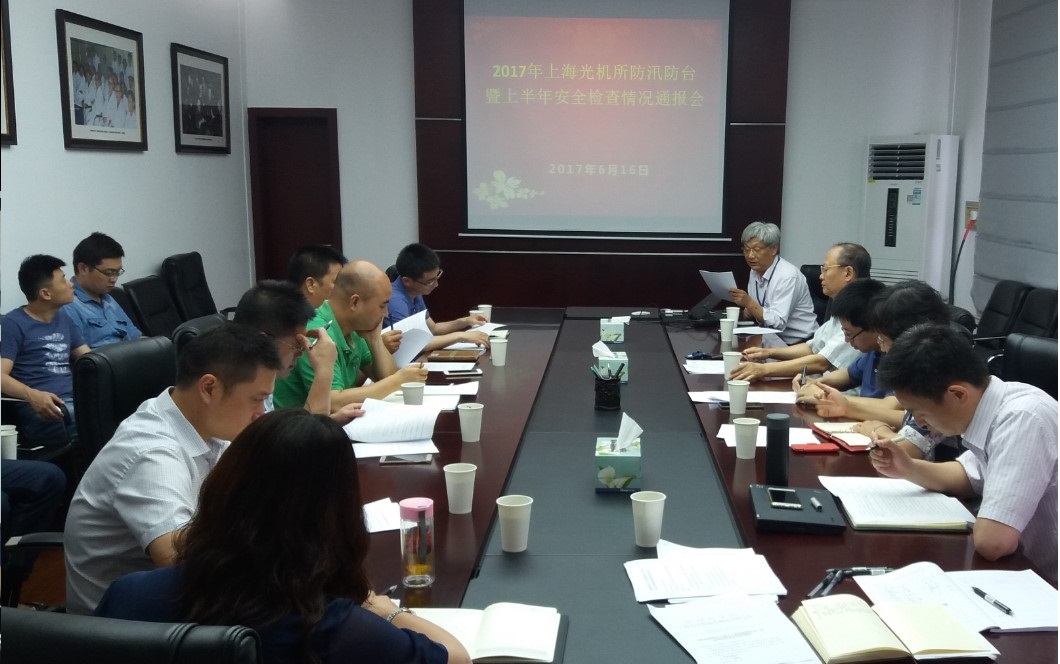 6月16日下午,2017年上海光机所防汛防台工作部署暨上半年安全检查通报会议在1号楼108会议室召开。祝如荣,所安委会办公室成员,所防汛防台小组成员,各部门安全员出席了会议。会议由所办公室卢其明主持。