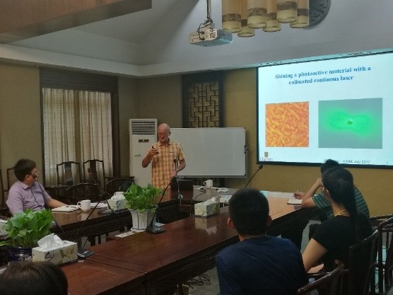 Jean-Michel Nunzi教授首先介绍了麦克斯韦方程、非线性光学效应、波函数、非线性极化率、磁化率等基本知识,并介绍了其实验室中可用于产生非线性光学的有机材料,如ethyl-violet,indigo,phtalocyanine,coumarine,rhodamine 6G等,以及这些材料在光调控及二次谐波产生等方面的应用。本次报告展示了非线性光学整体图画,并将非线性光学基本原理与非线性光学腔、非线性光学-光伏发电等热门课题联系起来。报告结束后,与会科研人员与Jean-Michel Nunzi教授就相关问题展开讨论和交流。