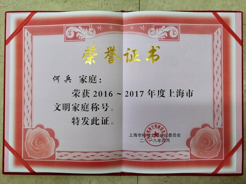 近日,上海市精神文明建设委员会授予全市200户家庭为2016-2017年度上海市文明家庭,上海光机所何兵家庭获此殊荣,为上海市科技系统唯一获评家庭。